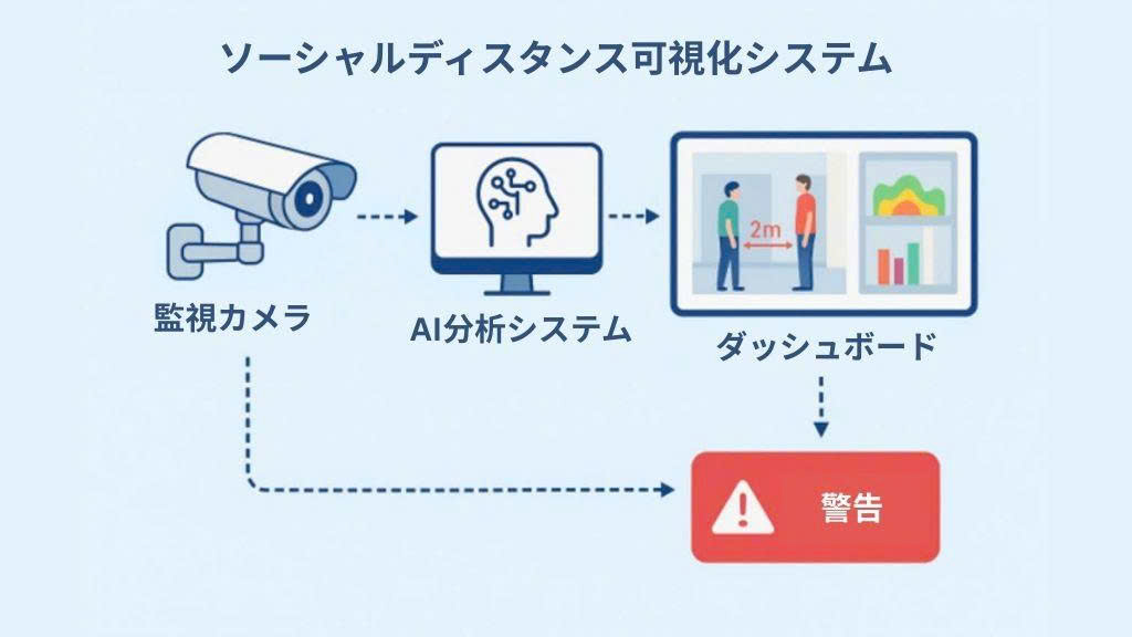ソーシャルディスタンス可視化システムとは、カメラ、IoTセンサー、人工知能(AI)、およびデータ分析ソフトウェアを活用して、現実環境における個人間の距離を監視・測定・リアルタイムで表示する技術ソリューションです。結果は、ヒートマップ、警告色を付与した映像、または数値ダッシュボードなどの直感的なビジュアルで表現され、管理者が容易に状況を把握し、意思決定を行えるように支援します。